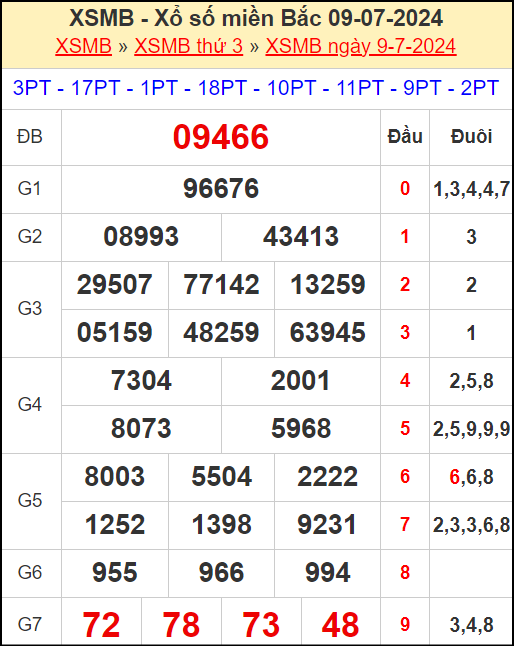 Kết quả xổ số miền Bắc ngày 9/7/2024