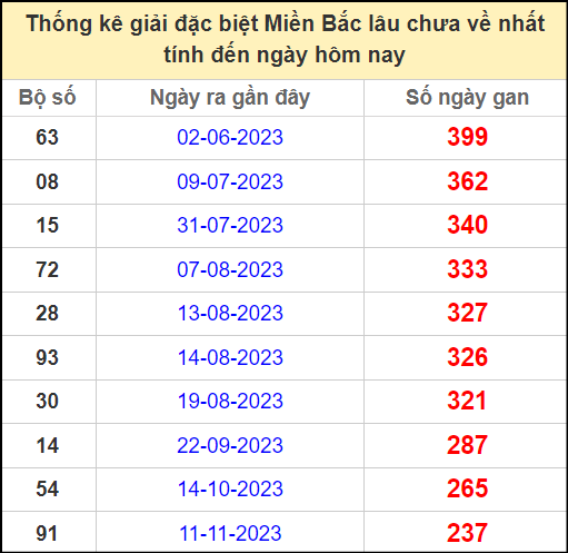 Thống kê gan giải đặc biệt miền Bắc lâu chưa về 10/7/2024