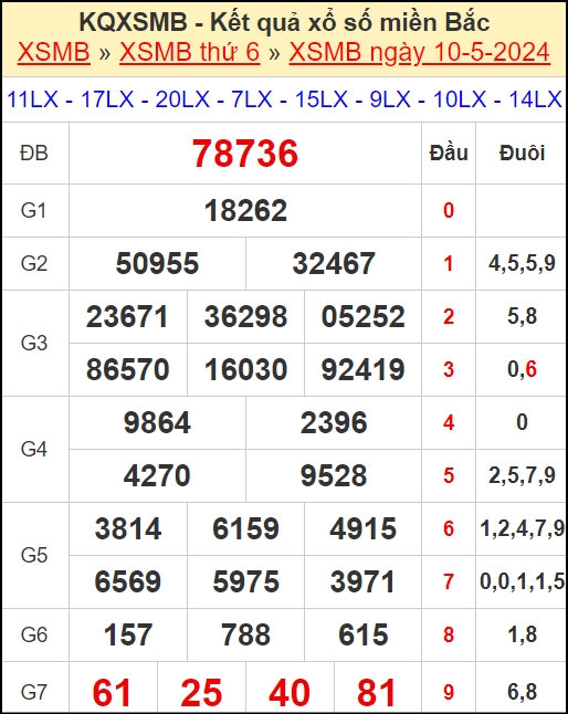 Những con số thống kê mới nhất trong 30 lần mở thưởng gần nhất, soi cầu lô đề miền Bắc (thống kê lô chơi nhiều nhất trong ngày, chu kỳ giải đặc biệt, thống kê lô gan, thống kê các bộ số xuất hiện ít nhất, tần suất lô) để bạn có thể chốt số. Từ những thống kê này người chơi sẽ có được kết quả soi cầu dự đoán giải đặc biệt ngày mai và lựa chọn ra đúng kết quả hôm nay ngày 11/5/2024.