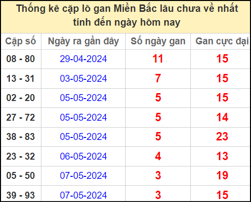 ⚡ Thống kê cặp số lâu chưa ra: 08 – 80, 13 – 31, 02 – 20