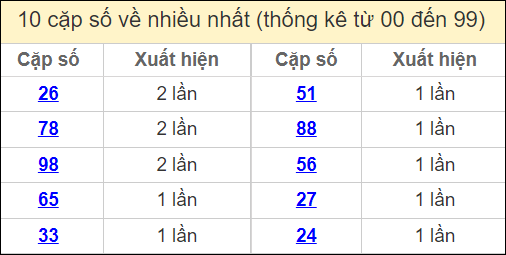 Những con số thống kê mới nhất trong 30 lần mở thưởng gần nhất, soi cầu lô đề miền Bắc (thống kê lô chơi nhiều nhất trong ngày, chu kỳ giải đặc biệt, thống kê lô gan, thống kê các bộ số xuất hiện ít nhất, tần suất lô) để bạn có thể chốt số. Từ những thống kê này người chơi sẽ có được kết quả soi cầu dự đoán giải đặc biệt ngày mai và lựa chọn ra đúng kết quả hôm nay ngày 11/6/2024.