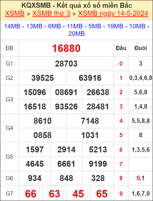 Kết quả xổ số miền Bắc ngày 14/5/2024