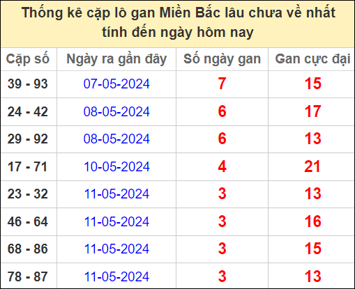 Thống kê lô cặp miền Bắc lâu chưa về 15/5/2024