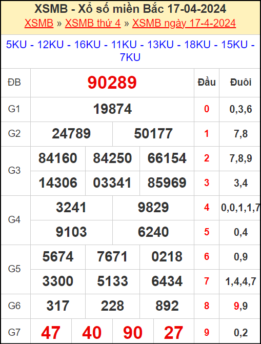 Kết quả xổ số miền Bắc ngày 17/4/2024