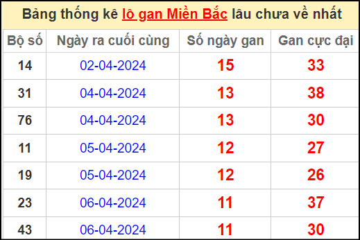 Thống kê lô gan miền Bắc lâu chưa về nhất 18/4/2024