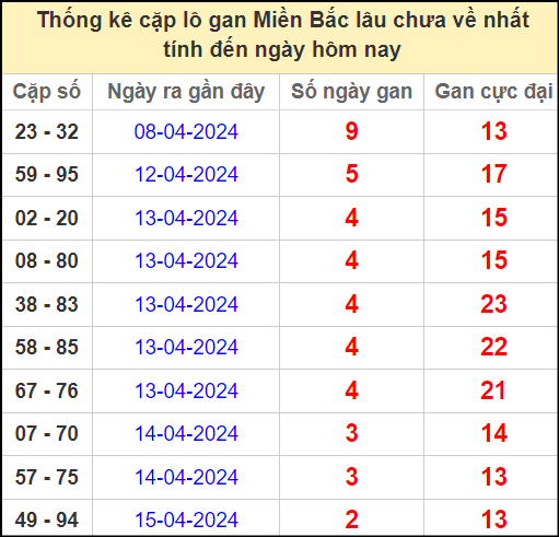 Thống kê lô cặp miền Bắc lâu chưa về 18/4/2024