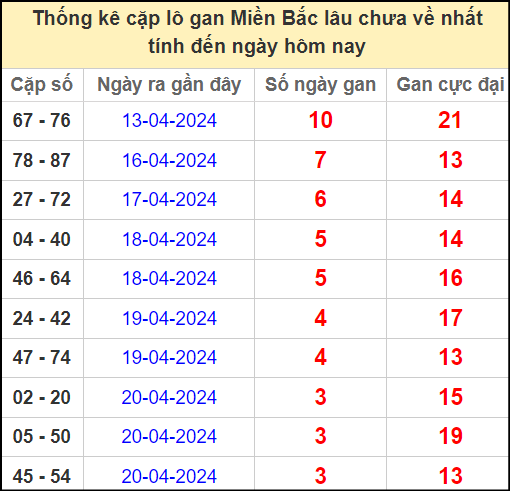 Những con số thống kê mới nhất trong 30 lần mở thưởng gần nhất, soi cầu lô đề miền Bắc (thống kê lô chơi nhiều nhất trong ngày, chu kỳ giải đặc biệt, thống kê lô gan, thống kê các bộ số xuất hiện ít nhất, tần suất lô) để bạn có thể chốt số. Từ những thống kê này người chơi sẽ có được kết quả soi cầu dự đoán giải đặc biệt ngày mai và lựa chọn ra đúng kết quả hôm nay ngày 24/4/2024.