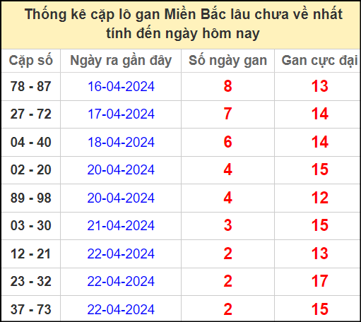 ⚡ Thống kê cặp số lâu chưa ra: 78 – 87, 27 – 72, 04 – 40