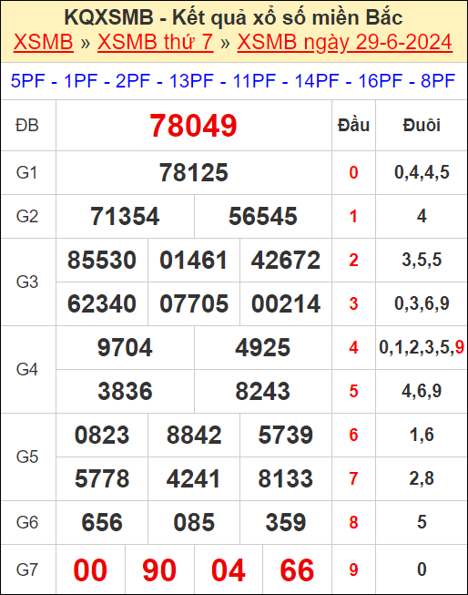 Kết quả xổ số miền Bắc ngày 29/6/2024