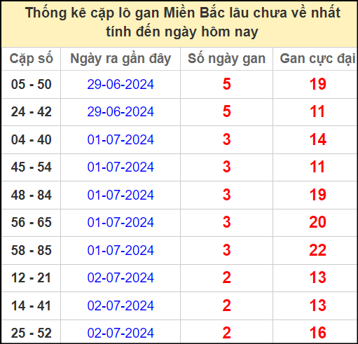 ⚡ Thống kê cặp số lâu chưa ra: 05 – 50, 24 – 42, 04 – 40