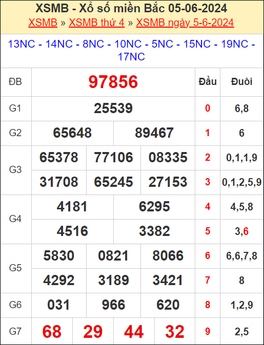Kết quả xổ số miền Bắc ngày 5/6/2024