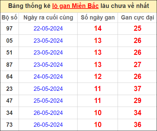 Thống kê lô gan miền Bắc lâu chưa về nhất 6/6/2024