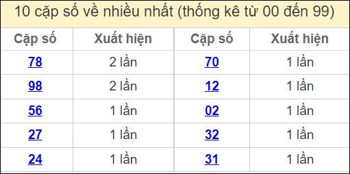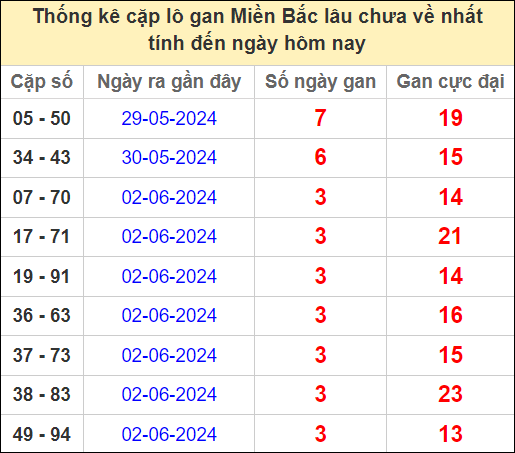 Thống kê lô cặp miền Bắc lâu chưa về 6/6/2024