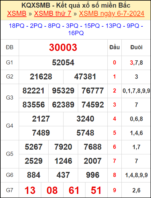 Kết quả xổ số miền Bắc ngày 6/7/2024