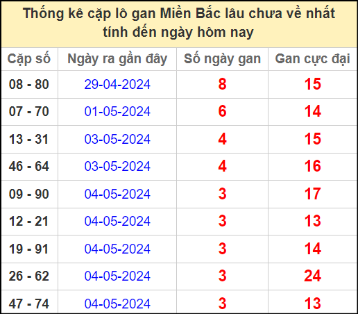 ⚡ Thống kê cặp số lâu chưa ra: 08 – 80, 07 – 70, 13 – 31
